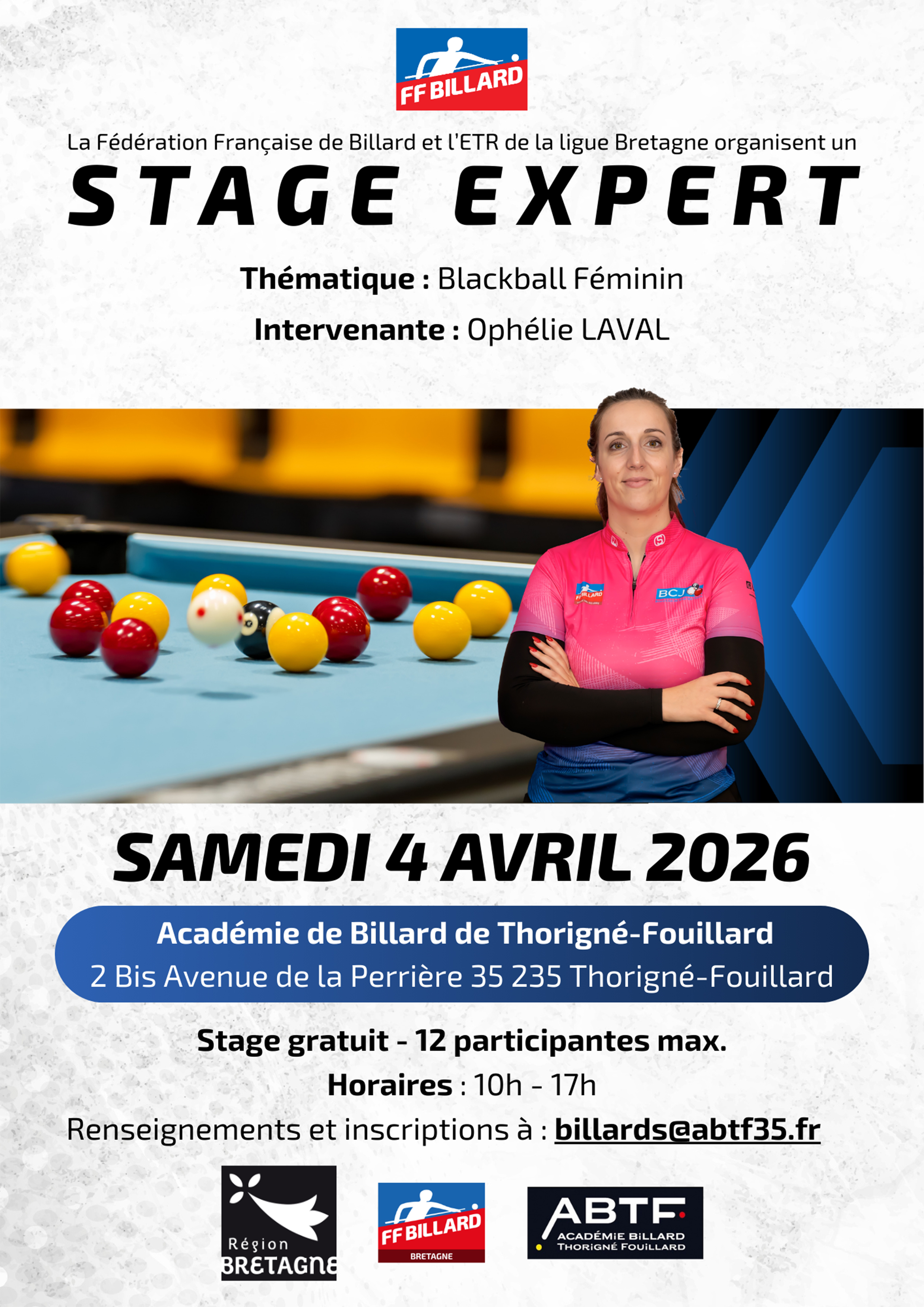 La Fédération Française de Billard, en collaboration avec l’ETR de la Ligue de Bretagne, organise un stage expert Blackball dédié aux joueuses féminines de la région.